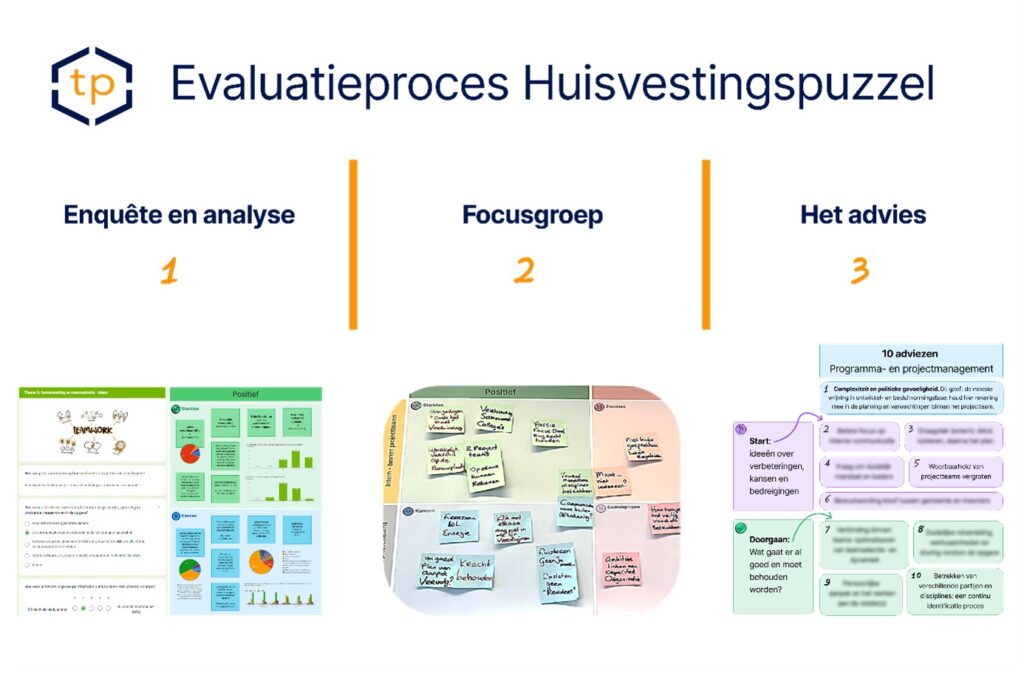 De evaluatie bestond uit twee onderdelen: een enquête onder betrokken medewerkers, waarvan de resultaten in een SWOT-analyse zijn verwerkt, en een focusgroep met projectteamleden om ervaringen uit te wisselen en te vergelijken met de enquête-uitkomsten.